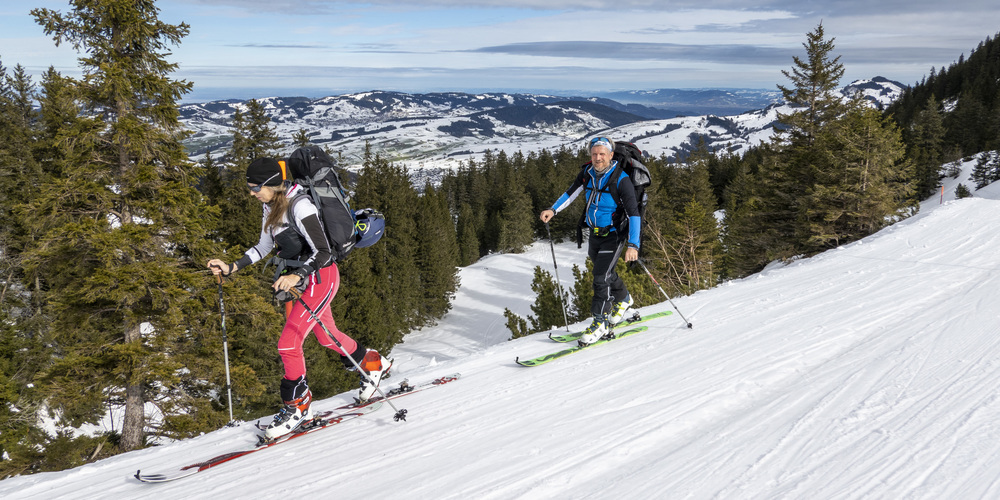 Es ist Morgen, die Piste ist noch hart. Von der Bergstation der Ebenalpbahn geht es über den Bergrücken steil hinunter Richtung Gartenwald, auf der mit schwarzen Schildern markierten Piste. Zum Aufwärmen genügen ein paar kurze Schwünge. Und eine Verschnaufpause kommt auch wegen der Aussicht nicht ungelegen: Der Föhn hat die Wolken weggeblasen, die Sicht ist an diesem Frühjahresmorgen nun so gut, dass man den Bodensee sieht.