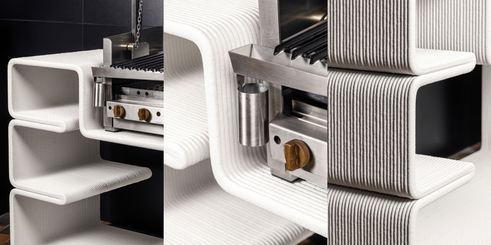 Stolz präsentiert die Grillmanufaktur Azado ihre neuste Innovation: Die wohl weltweit erste 3D-gedruckte Aussenküche, komplett aus Beton mit integriertem Azado-Grill. Eine filigrane und organisch geschwungene Konstruktion, welche den Chromstahl-Grill umspielt und in Szene setzt. Die Aussenküche «Manguera» ist in Schiefergrau oder Off-White erhältlich und bietet Arbeits- wie auch Ablageflächen beim Grillen und Kochen im Garten oder auf der Terrasse. 43 Minuten – nur so lange benötigt die Produktion dieser neuartigen Aussenküche.