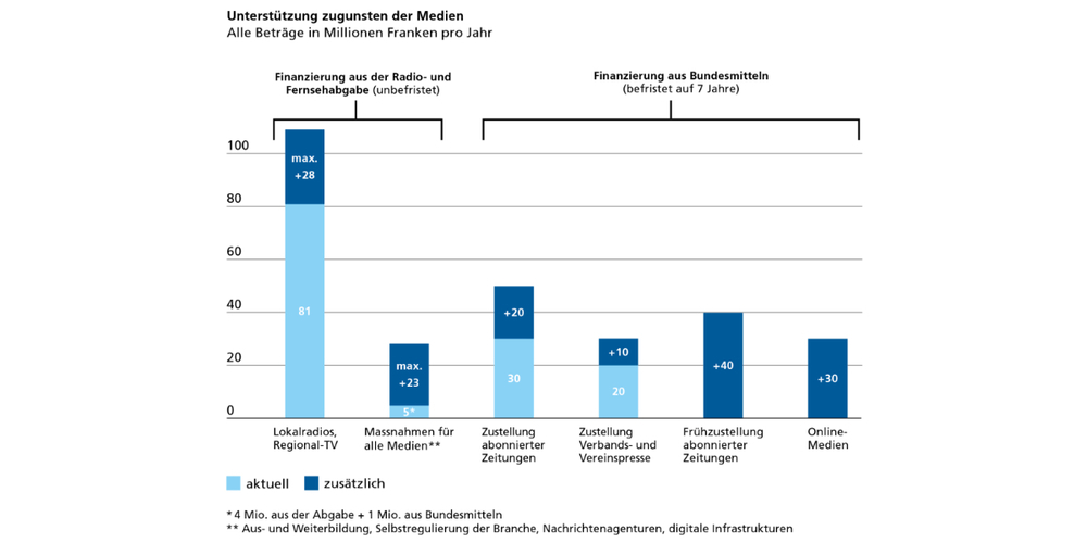 Neu werden zudem Sonntagszeitungen und Frühzustellungen finanziell unterstützt (40 Millionen). Dabei gebe es aber keinen oder wenige kleine Verlage, die eine Sonntagszeitung haben, wie die Gegner des Massnahmenpakets argumentieren.