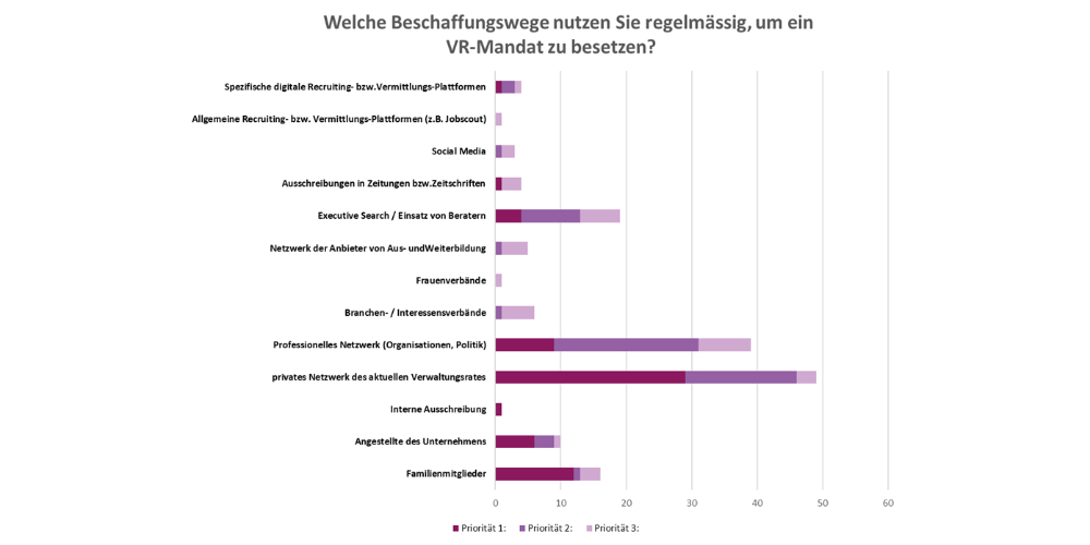 Dem privaten Netzwerk wird dabei mehr Beachtung geschenkt (über die Hälfte stuft es als Priorität eins ein), während das professionelle Netzwerk mit über der Hälfte auf Priorität zwei steht. Daraus lässt sich ableiten, dass eine Mehrheit zuerst das private und in einem zweiten Schritt das professionelle Netzwerk angeht, wenn ein VR-Mandat neu zu besetzen ist.