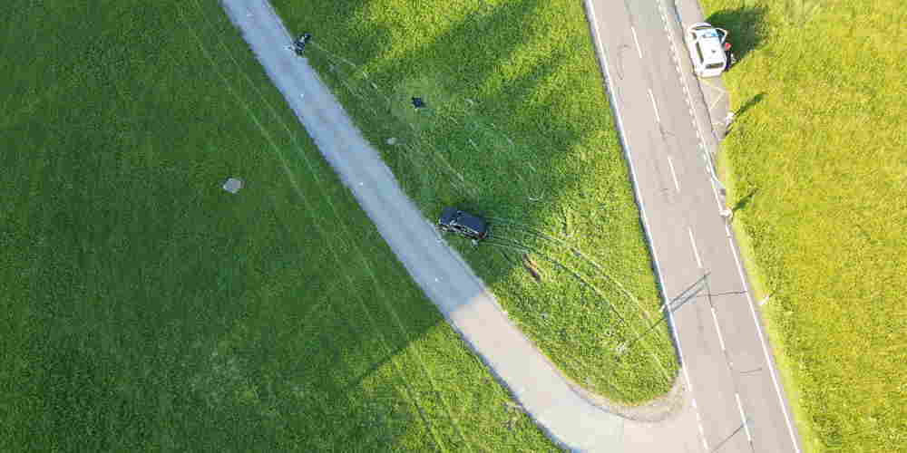 Durch die Wucht der Kollision wurde der Motorradfahrer in die angrenzende Wiese geschleudert. Auch das Auto kam in der Wiese zum Stillstand.