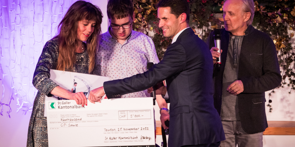 Ein weiteres Hauptziel der neuen «Weihnachtsshow»: Das Publikum nebst Unterhaltung persönlich über die Anliegen der GHG-Institution CP-Schule mit Interviewpartnern und Direktbetroffenen zu informieren und finanzielle Unterstützung generieren zu können. Schon am ersten Abend überreichte Christian Sutter von der Direktion der St.Galler Kantonalbank der CP-Leiterin Petra Mantz einen Check von über 5'000 Franken.