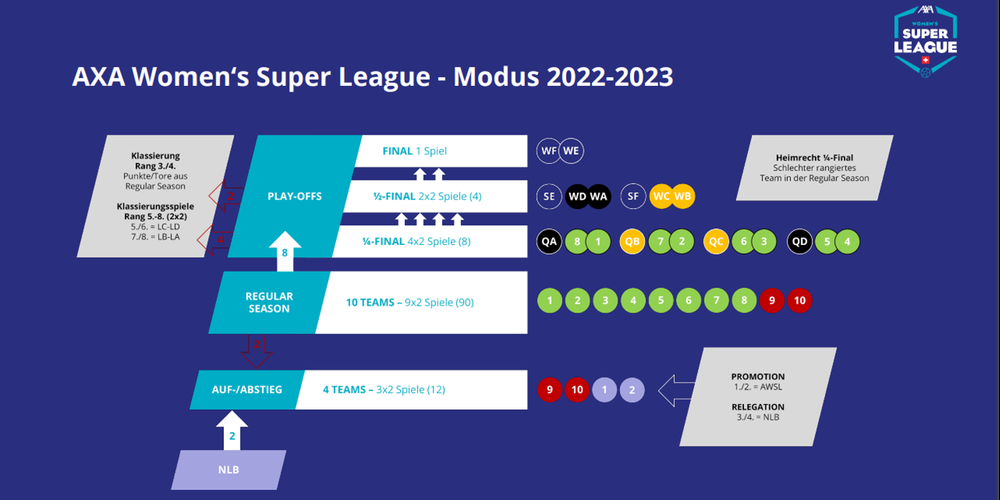 Schliesslich ist die Saison nach der 18. und letzten Runde der «Regular Season» am Wochenende nicht fertig. Seit der Spielzeit 2021/2022 findet die AXA Women's Super League (Awsl) in einem neuen Modus statt: Die besten acht von insgesamt zehn Teams der «Regular Season» spielen in Playoffs, die zwei Letztplatzierten müssen in die Auf-/Abstiegsrunde gegen die zwei besten der Nationalliga B.