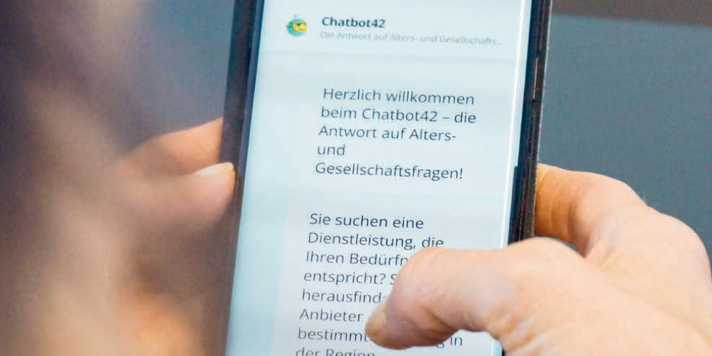 Der «Chatbot42» richtet sich auch an die Angehörigen unterstützungssuchender Menschen, da er Antworten zu Altersthemen wie beispielsweise dem Bereich der ambulanten und stationären Pflege, Finanzen, Freizeitangeboten oder Unterstützung im Alltag bietet. Dies geschieht zeit- und ortsunabhängig sowie anonym und soll regionale Angebote und Dienstleistungen zielgerichteter und damit effizient vermitteln.