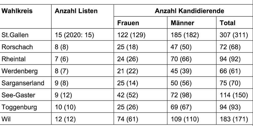 Um die 120 Sitze im Kantonsrat bewerben sich insgesamt 1005 Personen. Das sind rund 1.1 Prozent weniger als bei der letzten Erneuerungswahl im Jahr 2020 (1016).