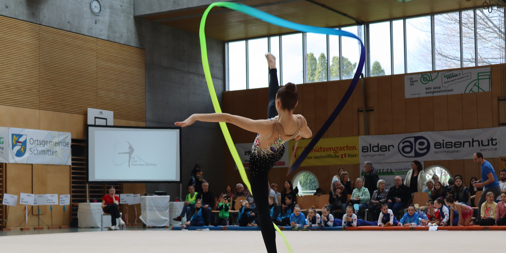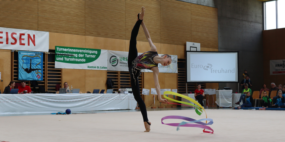 Die Seniorinnen (Jahrgang 2008 und älter) zeigten ihre Choreographien mit Ball, Band und Keulen. Die drei Kadergymnastinnen kämpften mit den Tücken der Halle. Da die Würfe mit den Handgeräten ein Mehrfaches der Körpergrösse ausmachen, bestand das Risiko, dass diese an der Decke aufprallen würden oder sich das Band sogar in den Aufhängungen verheddern könnte.