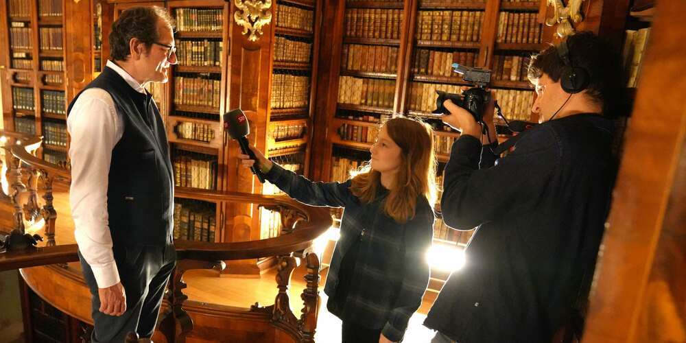 Seit diesem Schuljahr bietet SRF school einen speziell für den Unterricht konzipierten Medien-Workshop an. Alle zwei Wochen kommt eine andere Klasse in den Genuss. Ende März reiste das SRF-Team nach St.Gallen, um den dreitägigen Workshop mit der Klasse von Michèle Höpli durchzuführen. «Ziel ist es jeweils, dass am Schluss ein dreiminütiger Videobeitrag für die ‹SRF Kids News› und ein Onlinebeitrag für SRF Kids resultieren», sagt SRF-Redaktor Damian Haas. Das Thema würden die Kinder selbst aussuchen. Besagte Klasse habe sich einstimmig für die Stiftsbibliothek entschieden.