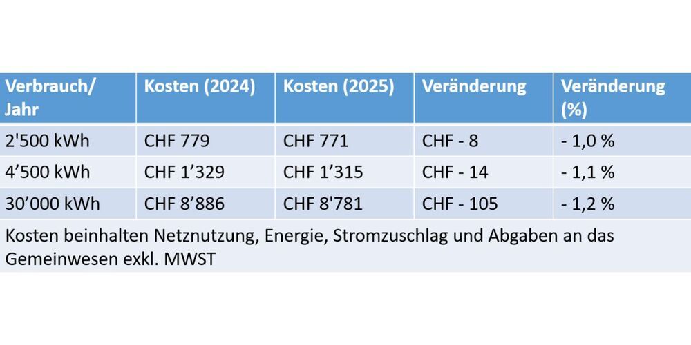 Einsparungen und Mehrkosten halten sich die Waage, weshalb der Energiepreis für das Jahr 2025 unverändert bleibt. Aufgrund der Umstellung der Preise von inklusive auf exklusive Mehrwertsteuer entstehen jedoch Rundungsdifferenzen.