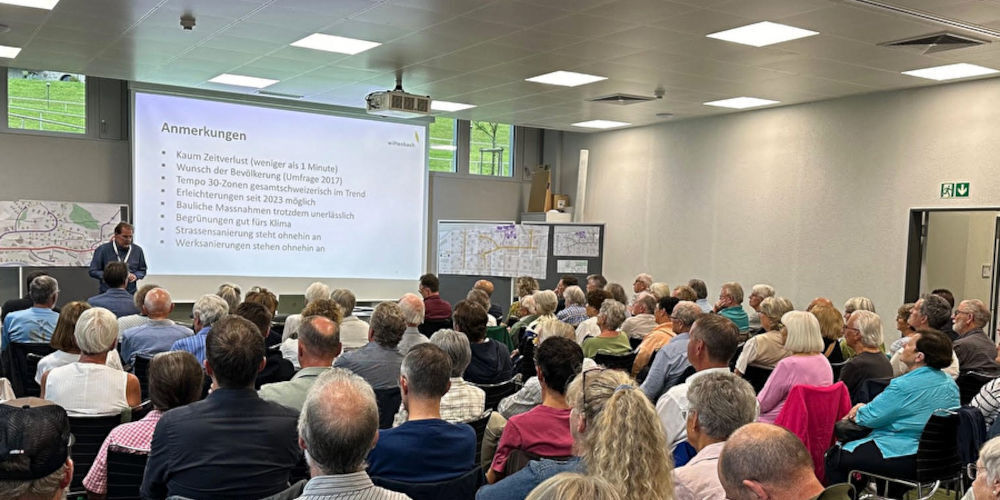Etwa 100 Personen folgten der Einladung und nahmen an der Informationsveranstaltung teil. Die Gemeinde Wittenbach und die Stadt St.Gallen erläuterten die Vorhaben zu Tempo-30-Zonen und Halbunterflurbehältern im Quartier und luden die Bevölkerung zur Diskussion ein.