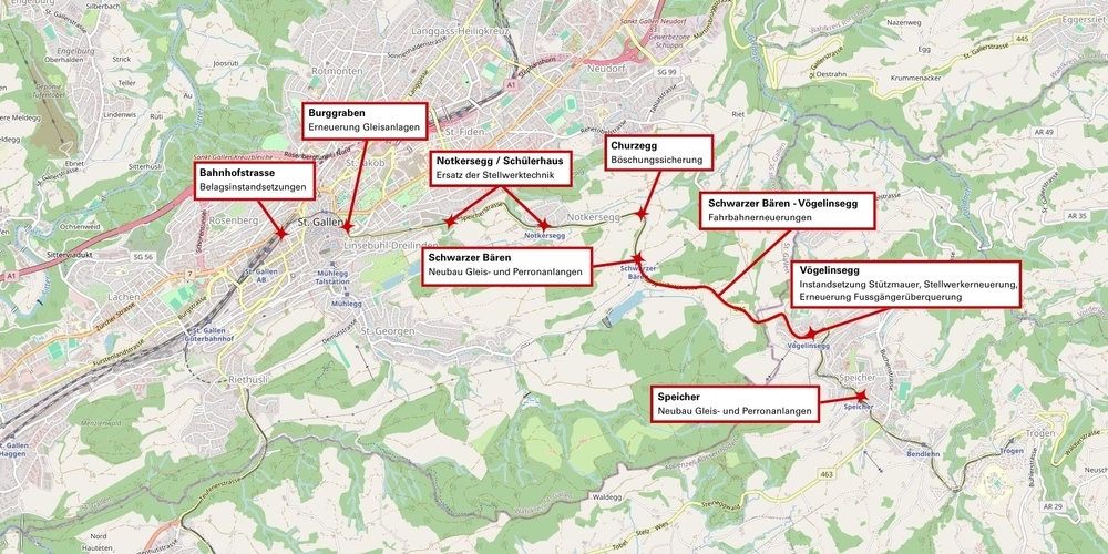 Weitere Fahrbahnerneuerungen betreffen die Abschnitte zwischen Schwarzer Bären und Vögelinsegg. Dort ersetzen die AB die Schienen, Schwellen und den Schotter. Bei der Haltestelle Vögelinsegg werden zudem zwei Weichen erneuert und das Mittelperron saniert. Auf der Bahnhofstrasse in St.Gallen erfolgen zwischen dem Rathaus und dem Schibenertor punktuelle Belagsinstandsetzungen im Gleisbereich.