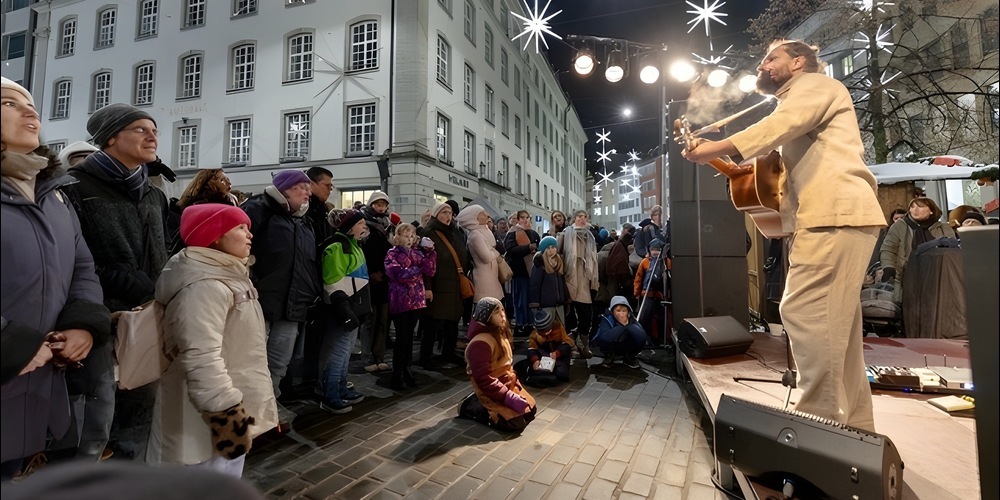 Der aus der Ostschweiz stammende Singer/Songwriter Shem Thomas begeisterte auf der publikumsnahen Bühne vor dem Vadian-Denkmal mit seinen Hits und leitete in einen für die meisten wohl langen Abend bei Glühwein und adventlicher Stimmung über.