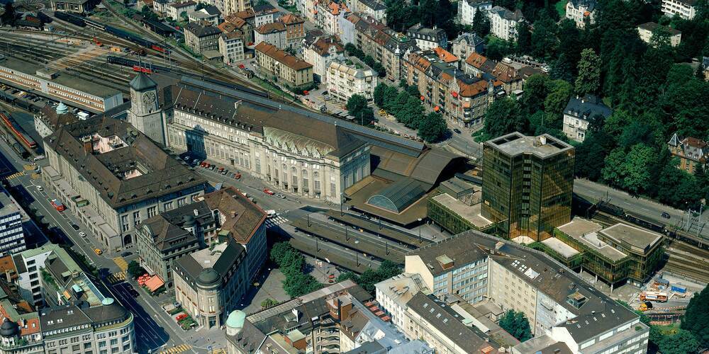 Zwischen 1974 und 1976 realisierte die Architekturgemeinschaft Custer, Hochstrasser und Bleiker das 15-stöckige Hochhaus an der Stelle des alten Bahnhofs von 1856.
