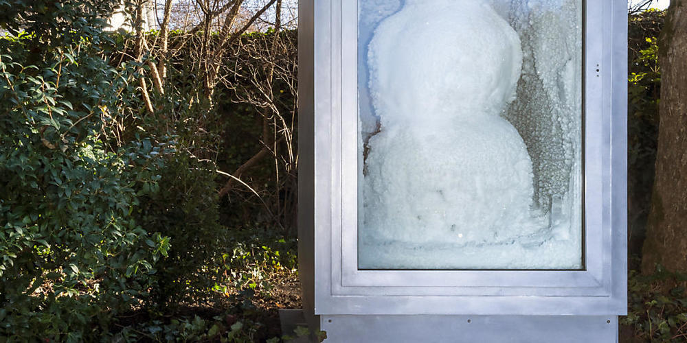 Nun hat dieser eine "Snowman" im Park der Fondation Beyeler eine definitive Bleibe gefunden - als einziges Exemplar in Europa. Eine mit Sonnenenergie betriebene Kühltruhe sorgt dafür, dass dieser Schneemann auch bei wärmeren Temperaturen nicht schmilzt. Das Bild der vollkommenen Abhängigkeit von Energie habe inmitten der Klimadiskussion eine neue, abgründige Dimension erhalten, schreibt das Museum dazu.