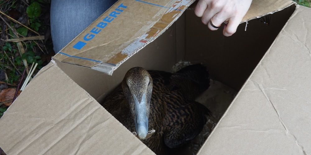 Die Vorgeschichte ist dramatisch bis tragisch. Dramatisch bei der Eiderfamilie: Krocki, das Weibchen, und ihr Mann Rocky waren ein glückliches Paar, bis eines Tages Rocky ausbüxte. Auf einen Hinweis aus der Bevölkerung wurde er von der Polizei eingefangen und bei der Volière abgegeben. Dank der Marke konnte seine Herkunft aus dem Nestweiher festgestellt werden.