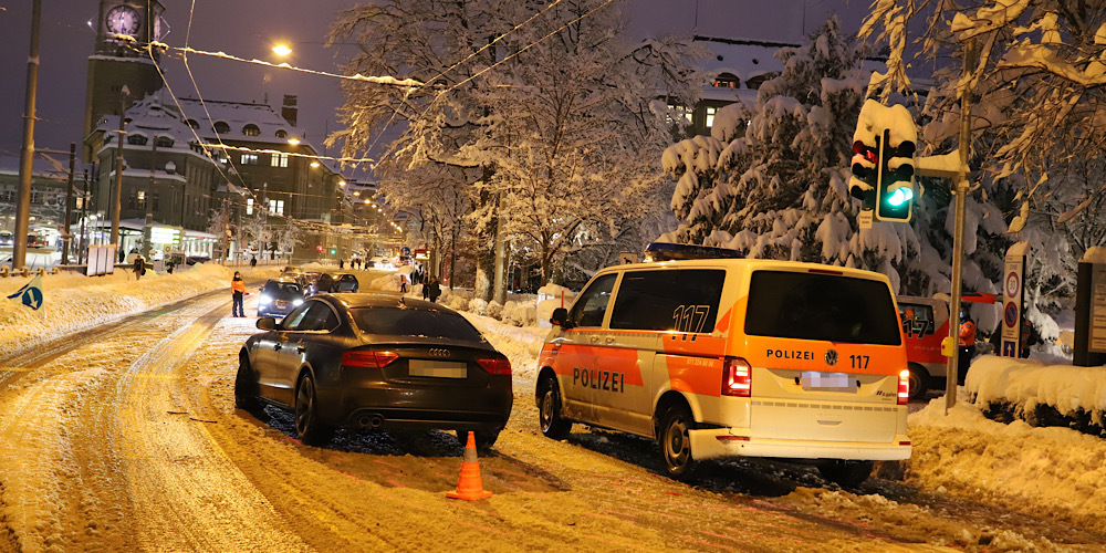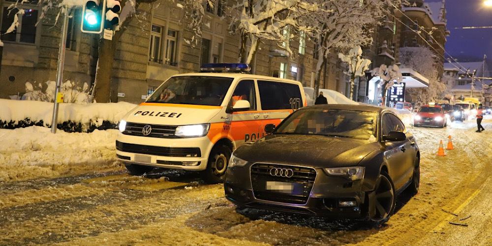 Auf Höhe der Pestalozzistrasse hielt ein Patrouillenauto der Stadtpolizei St.Gallen an, um ein anderes Auto passieren zu lassen. Der 29-jährige Autofahrer versuchte zu bremsen, geriet aber aufgrund der Sommerpneus ins Rutschen. Er versuchte nach links auf die Gegenfahrbahn auszuweichen, kollidierte aber dennoch mit dem Patrouillenauto. Auf der Gegenfahrbahn kam es zu einer weiteren Kollision mit einem entgegenkommenden Bus.