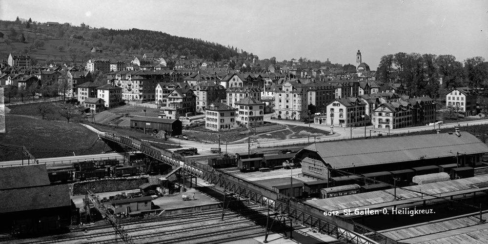 Die Flugaufnahme aus dem Jahr 1937 zeigt eindrücklich die Quartiere Langgasse, Buchwald, Heimat, und Heiligkreuz. Gut zu sehen sind der Bahnhof St.Fiden (errichtet 1891), die evangelische Kirche Heiligkreuz (1911-1913) und das Schulhaus Gerhalden (1906/1907)