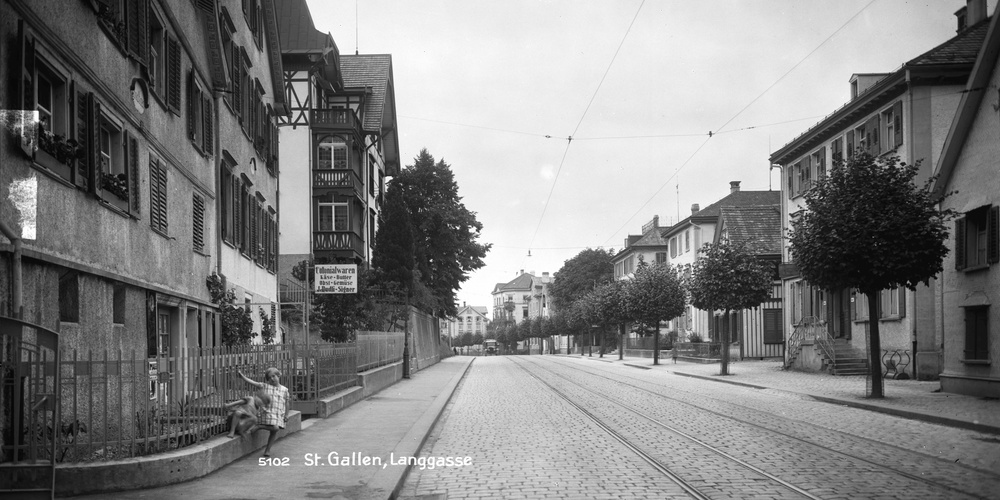 Ein aufgeräumtes Bild: die Wohnhäuser entlang der von Bäumen gesäumten Langgasse im Jahr 1931. In der Bildmitte sind die Tramlinien des bis ins Jahr 1957 bestehenden Sanktgaller Trambetriebs zu sehen