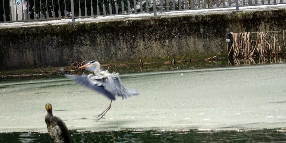 Der fremde Besucher animiert offenbar auch den Graureiher zu einem kurzen Ausflug: Er, der sonst stundenlang stoisch auf dem Holznest ausharrt, schwingt sich plötzlich in die Luft und landet auf dem Eis am Uferrand, um danach wie auf einem Laufsteg vor den „gewöhnlichen“ Bewohnern herumzustolzieren.