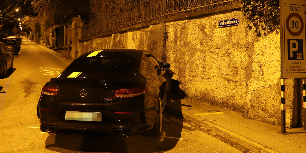 Rund 30 Minuten später wurde eine Patrouille der Kantonspolizei St.Gallen auf einen Selbstunfall an der Zwinglistrasse aufmerksam. Beim verunfallten Fahrzeug handelte es sich um das Auto, das die Stadtpolizei zuvor kontrollieren wollte. Der Benz prallte aus noch unklaren Gründen frontal gegen eine Stützmauer. Verletzt wurde niemand. Es entstand jedoch hoher Sachschaden.