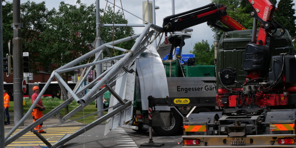 Der Kranarm war nicht ganz eingefahren; so kam es zum spektakulären Unfall. «Ob es Fahrlässigkeit oder ein technisches Problem war, muss nun abgeklärt werden», sagte Klaus-Dieter Mennel, Mediensprecher der Stadtpolizei St.Gallen, zu stgallen24.