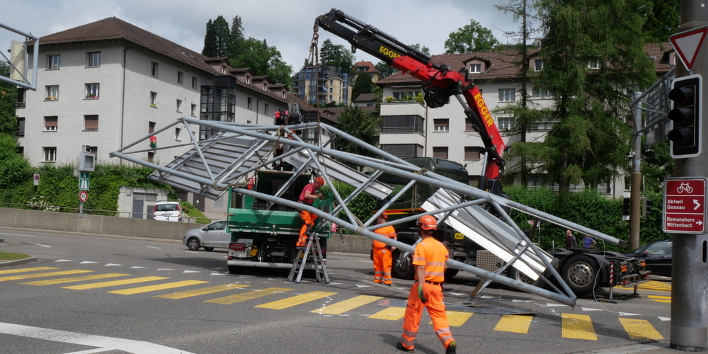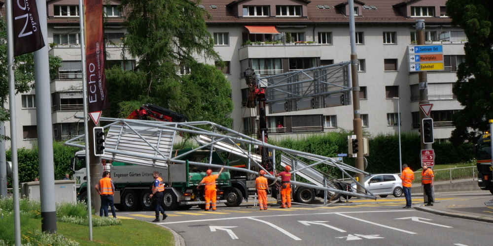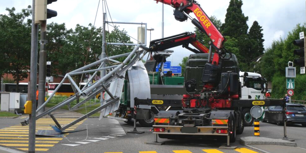 Kuriose Bilder vor der Autobahneinfahrt bei der Kreuzbleiche: Ein Lastwagen hat am Freitagmorgen um 10 Uhr eine Ampel mitsamt Gerüst und Signalisation mitgerissen.