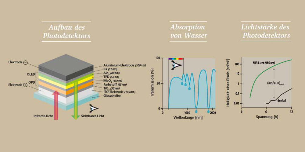 Das SWIR-Licht fällt durch eine elektrisch leitfähige Glasscheibe auf eine Farbstoffschicht in einem Photodetektor. Dort beginnen Elektronen zu wandern – diese Wanderungsbewegung wird durch eine elektrische Spannung verstärkt. Die elektrischen Ladungen wandern dann in die OLED-Schicht und erzeugen dort einen grünen Lichtpunkt.