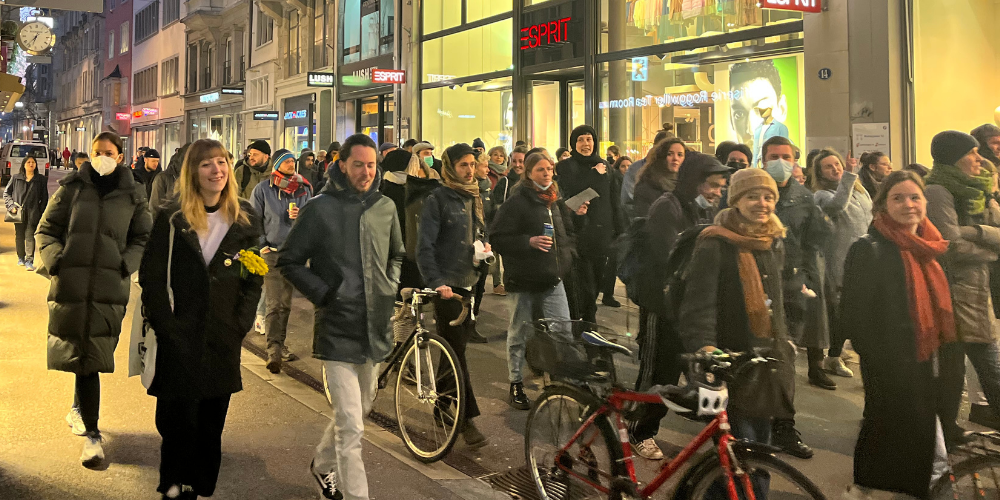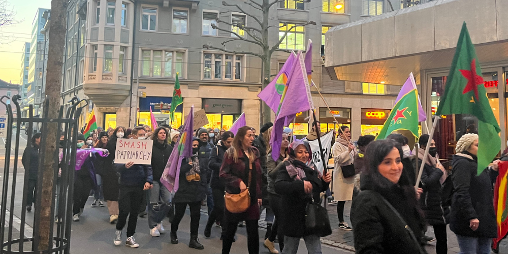 Um 18 Uhr versammelten sich über Hundert Menschen auf dem Kornhausplatz und marschierten von da durch die Innenstadt. Kurdinnen tanzten und sangen und machten damit auf die Situation in Nord- und Ostsyrien aufmerksam. Denn Rojava gilt als ein Vorbild der feministischen Revolution und zeige auf, dass es möglich sei, dem patriarchalen System entgegenzuwirken. Um 20.15 fand dazu noch eine Lesung im Palace statt.