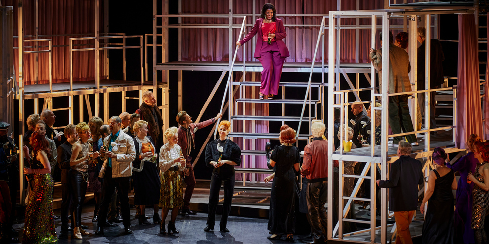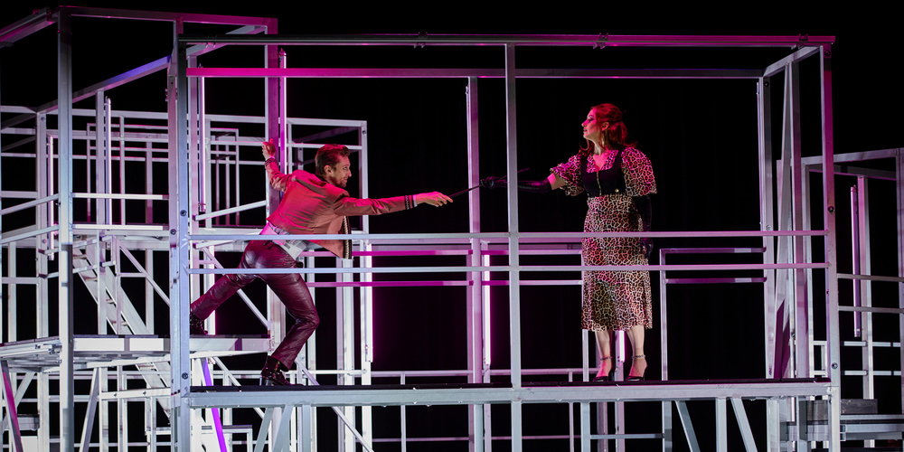 Das moderne Bühnenbild darf einen ebensowenig schrecken wie die schrillen Kleider der Darsteller im Rock'n'Roll-Disco-Pop-Stil. Das Gerüstelement im Zentrum der Bühne symbolisiere Violettas Welt, sagt Regisseurin Nina Russi, das leere Zentrum stehe für Violetta, um die sich das Lebenskarussell drehe. Kann man so sehen, mich hat die modernisitische Inszenierung zumindest nicht gestört; zu gut war die musikalische Umsetzung, als dass ihr das karge Bühnenbild etwas anhaben könnte.