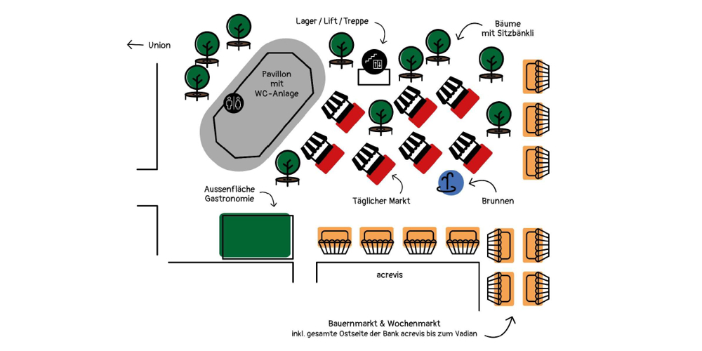Das Vorprojekt berücksichtigt zwei Anliegen der Markthändler. So wurde darauf verzichtet, die mobilen Marktstände in der Marktgasse zu verzetteln und bei den Pavillons eine Rückseite zur Strasse hin zu schaffen. «Wir wurden in drei Sitzungen jeweils über den Stand der Arbeiten informiert, wirklich in einen Dialog darüber eintreten konnten wir aber leider nicht», bedauert Peter Wetli vom ständigen Markt.
