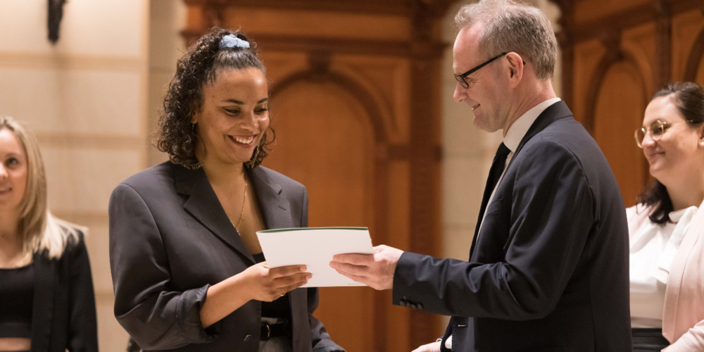 Larissa Schuler, Studiengangsleiterin Sekundarstufe I, durfte die Prämierung von zwei Masterarbeiten mit je CHF 1000 verkünden. Ausgezeichnet wurde die Arbeit zum Thema «Fachdidaktische Aufarbeitung der Sprachmittlung im Französischunterricht - Eine Aufgabensammlung von Strategie- und Sprachmittlungsaufgaben zur erleichterten Bewältigung von Sprachmittlungssituationen mit Anknüpfungsmöglichkeiten zum Lehrmittel dis donc!» von Melanie Schefer aus Uzwil. Die zweite Auszeichnung ging an Luc Fischbacher aus Neukirch. Das Thema seiner Arbeit lautet «Das Quartier Lachen in St.Gallen im Umbruch. Sozialräumliche Entwicklung und Gentrifizierung».