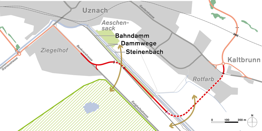 Die heutige Benkner-/ Ewigkeitsstrasse wird auf einer Länge von circa 800 Metern nach Norden an die Bahnlinie verlegt. Der Abstand zum Naturschutzgebiet Kaltbrunner Riet wird so gegenüber heute um 90 bis 140 Meter vergrössert. Dadurch wird das Schutzgebiet Kaltbrunner Riet aufgewertet.