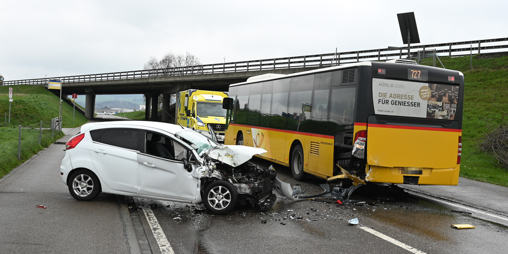 Ein 59-jähriger Chauffeur fuhr mit einem Postauto mit Passagieren von Niederwil in Richtung Gossau. Hinter dem Postauto fuhr eine 21-Jährige in ihrem Auto in die gleiche Richtung. Bei der Haltestelle Degenau hielt das Postauto an, um weitere Personen einsteigen zu lassen. Dabei prallte die 21-Jährige mit ihrem Auto aus unbekannten Gründen in den stehenden Bus und kam auf der Gegenfahrbahn zum Stillstand.