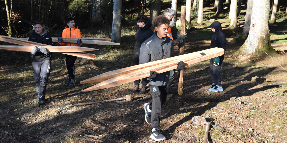 Die Schüler der Flade machten sich also auch mit Wiedehopfhauen, Baumscheren, Pfahlrammer und Arbeitshandschuhen im Wissholz-Wald bei Gossau ans Werk. Dieser ist Teil des 320-Hektar-Waldbesitz des Katholischen Konfessionsteil des Kantons St.Gallen. Mittendrin hat kürzlich das Forstteam des Konfessionsteils unter der Leitung von Förster Patrik Schilling auf einer Fläche von rund 800 Quadratmetern zahlreiche Weisstannen gefällt. Das Holz wird zur Erneuerung der Gehwege im Dachstuhl der Kathedrale benötigt.