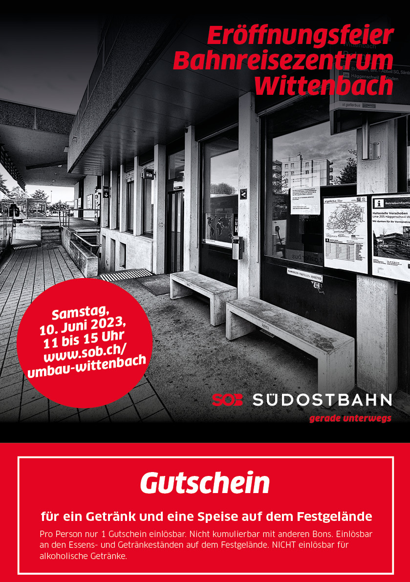 Nach einer viermonatigen Umbauphase wird am Samstag, 10. Juni, das neue Bahnreisezentrum Wittenbach der Südostbahn (SOB) feierlich eröffnet. Von 11.00 bis 15.00 Uhr ist die Bevölkerung eingeladen, sich auf einem Rundgang durch das modernisierte Bahnreisezentrum selbst ein Bild zu machen.