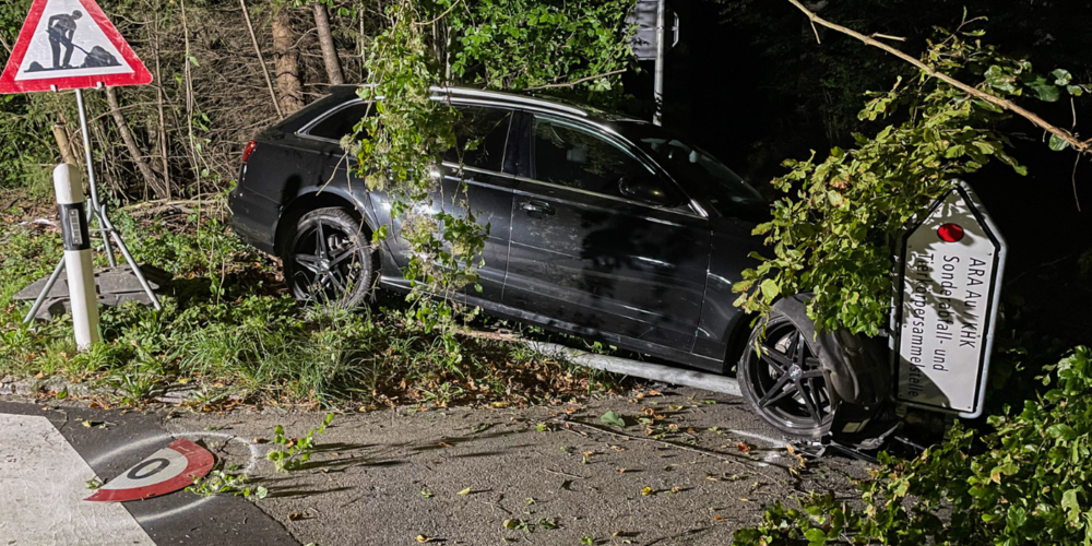 Infolgedessen touchierte er eine Baumulde und überfuhr einen Wegweiser, bis er schlussendlich mit einem Baum kollidierte und zum Stillstand kam. Verletzt wurde niemand. Bei dem Unfall entstand erheblicher Sachschaden am Fahrzeug, den Verkehrstafeln sowie Flurschaden.
