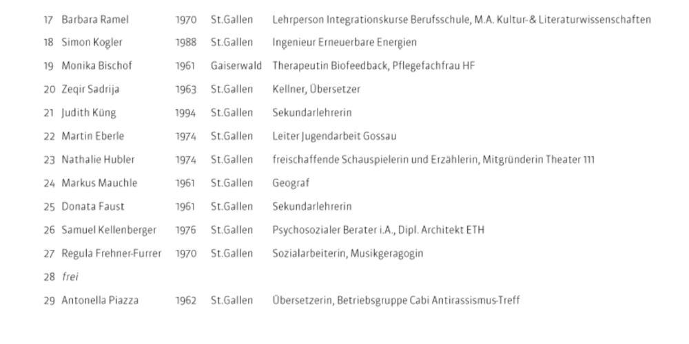 Auf Platz 4 vervollständigt mit Jeyakumar Thurairajah ein ausgebildeter Pflegefachmann HF aus dem Kantonsspital St.Gallen das Spitzenquintett. Thurairajah ist 1988 vom Bürgerkrieg in Sri Lanka in die Schweiz geflüchtet und politisiert seit über sieben Jahren im Stadtparlament St.Gallen für die Grünen.