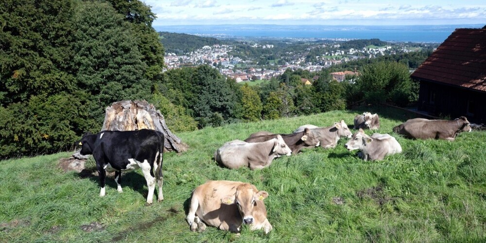 «Wir haben 48 Hektaren Land, alles in der Bergzone 1, die meisten unserer Flächen sind in Hanglage, zwischen 800 und 900 Metern über dem Meer», sagt Bäuerin Petra Fäh. Die Höhenlage führt dazu, dass die Vegetation im Frühling später erwacht und die Pflanzen im Herbst das Wachstum früher einstellen als beispielsweise am Bodensee. Die Topografie schränkt die Bewirtschaftungsmöglichkeiten zusätzlich ein. «Ackerbau oder Obstbau wären hier nicht sinnvoll. Deshalb liegt es nahe, auf dem Grasland Milch und Fleisch zu produzieren», sagt Petra Fäh. Auf dem Bauernhof Notkersegg steht seit jeher die Milchwirtschaft im Vordergrund. Und Fleisch ist bei der Milchwirtschaft – wie eigentlich bei jeder Tierhaltung – ein logisches Nebenprodukt.