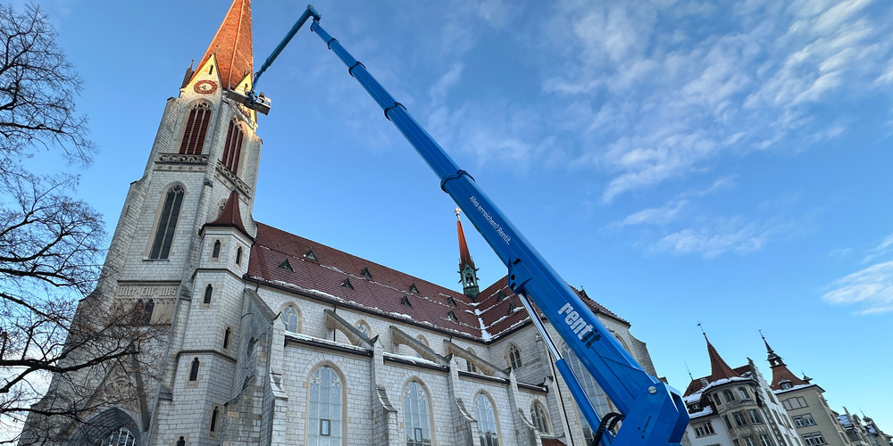 Am Turm und am Dach der Kirche St.Otmar sind dieser Tage Unterhaltsarbeiten vorgenommen worden. Die Turmspitze erreicht eine schwindelerregende Höhe von etwa 73,5 Metern und prägt das Stadtbild markant.
