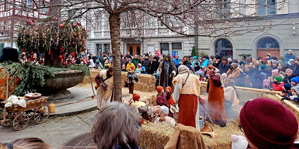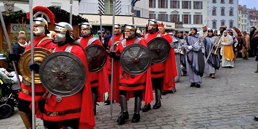 Der Zug der Römer, Hirten, Bürger und natürlich Josef, Maria und das Jesuskind führte die Menge um 13:45 Uhr vom Klosterplatz durch die Altstadt hin zum Vadianplatz, wo die Besucher sodann einem Gespräch zwischen Herodes, seinen Legionären und den Drei Königen lauschen konnten, ehe sie mit dem Befehl des Kindermords zur Schmidgasse geschickt wurden. Einer der Berater von Herodes hegte aber zurecht Zweifel und wurde dafür in den Kerker geschmissen.