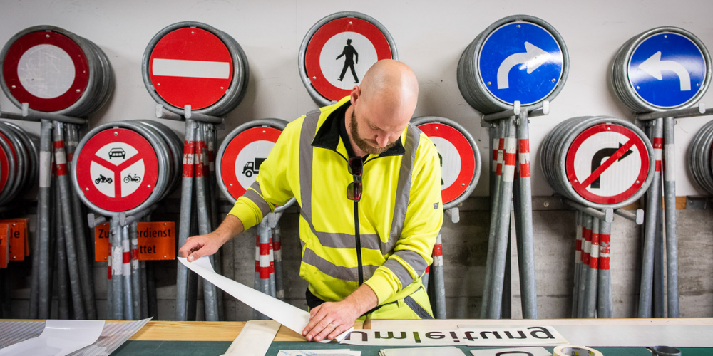 Mit dem Signalisations-Team, das im Werkhof Waldau stationiert ist, kann die Stadtpolizei rasch auf neue Anforderungen reagieren. Muss es besonders schnell gehen, kann eine Signaltafel innert weniger Stunden produziert und aufgestellt werden. Im Werkhof, in der Halle für temporäre Signalisation, werden die Schilder eigenhändig gefertigt. Dafür bekleben Cozzios Männer Blech-Rohlinge, die bereits geformt, gebohrt und abgekantet in den Werkhof geliefert werden. Dem Team stehen die nötigen Folien und Filme sowie ein Plotter zur Verfügung. «Dank dieser Selbständigkeit fahren wir deutlich günstiger, als wenn wir Signale einkaufen», sagt Hugo Cozzio.